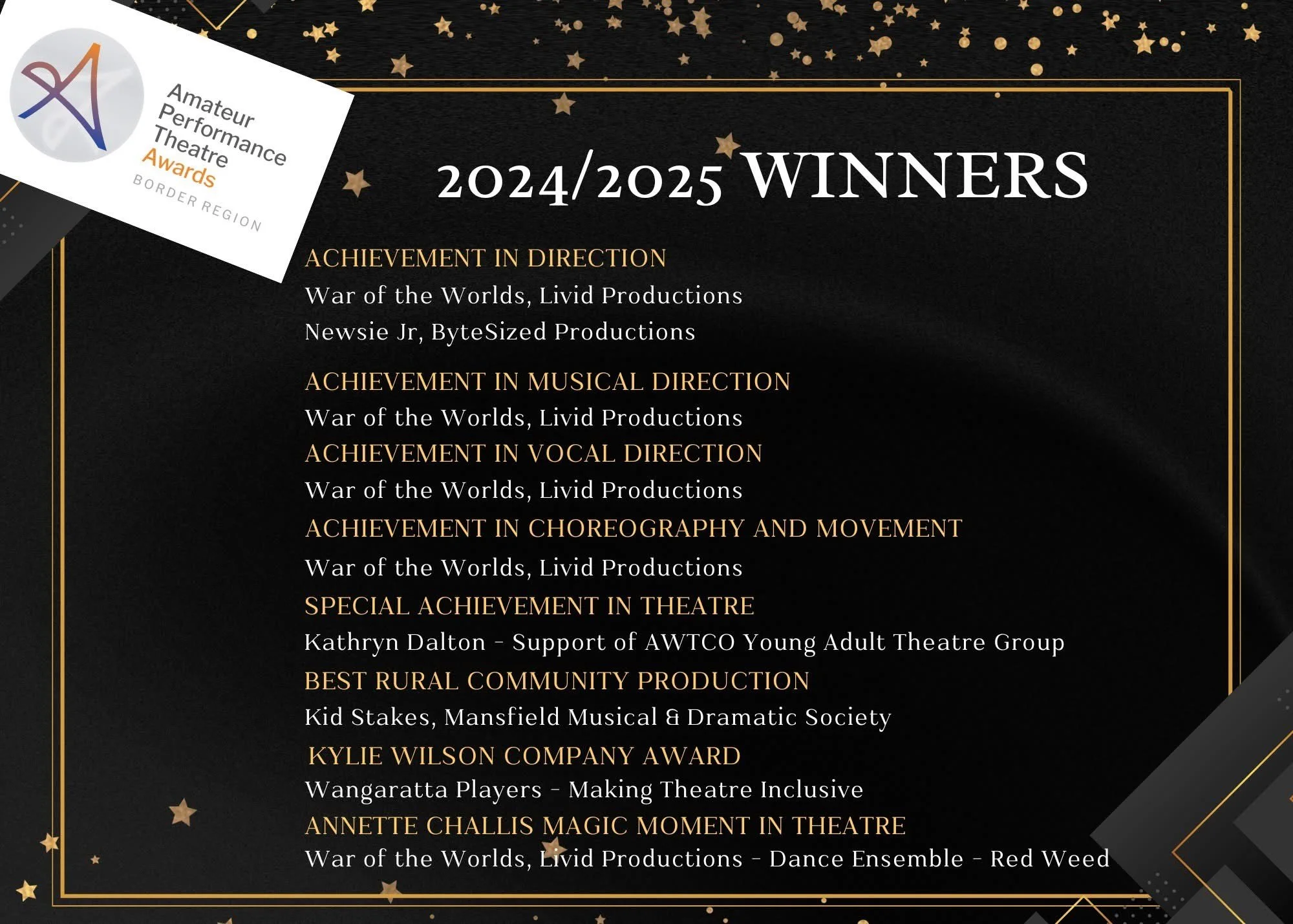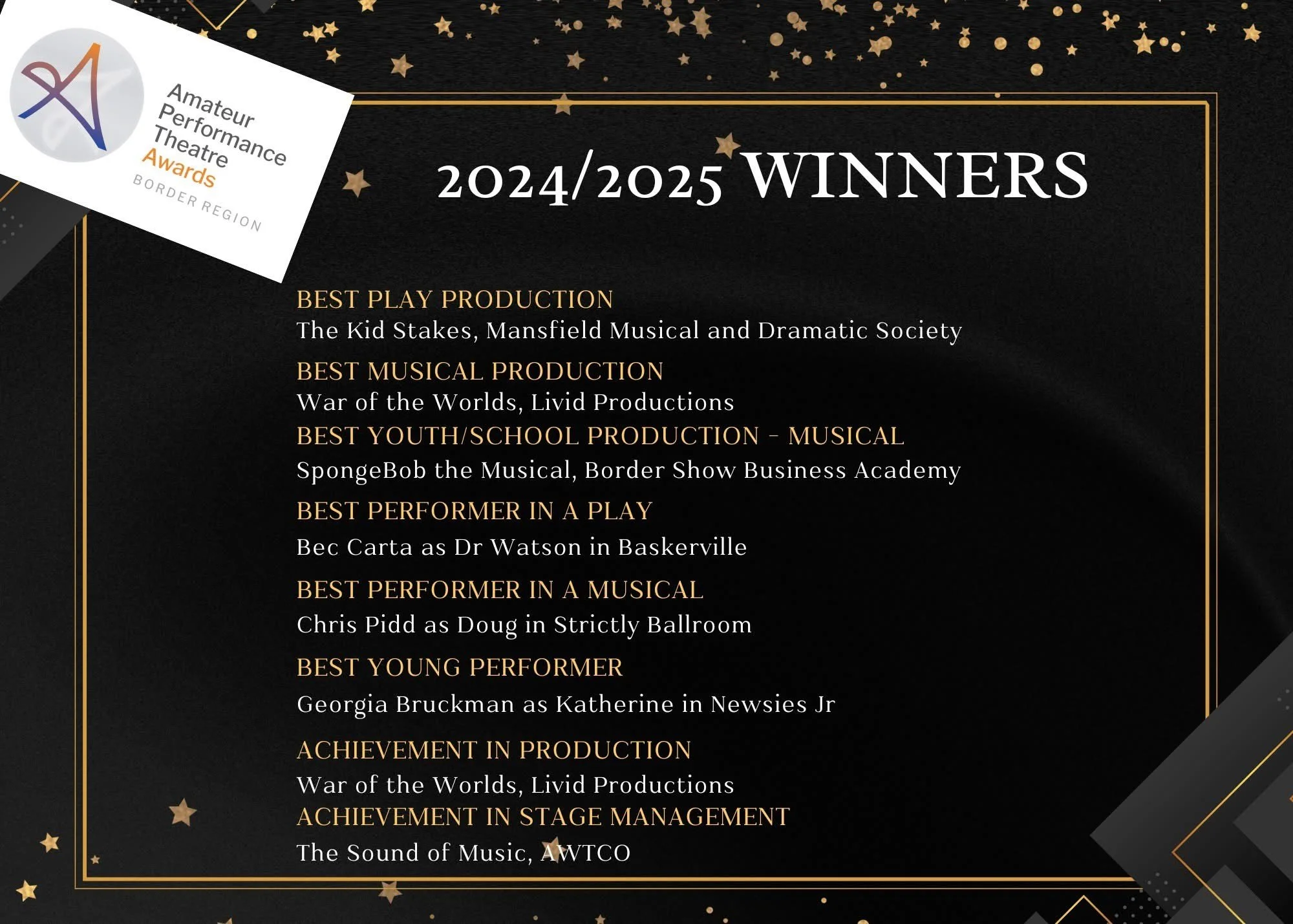 It was a bonus to find out that MMuDS play Kid Stakes, that I directed in 2024, was nominated in several categories. While I don’t take awards as validation of what was done it is a nice acknowledgment’ Everybody associated with this production did an outstanding job and it showed during the performances. I think Ray Lawler would have been proud. Lets do more Australian Theatre and showcase more Australian stories. In a world where the culture of Hollywood dominates lets give our audiences an opportunity to hear and see our stories.
